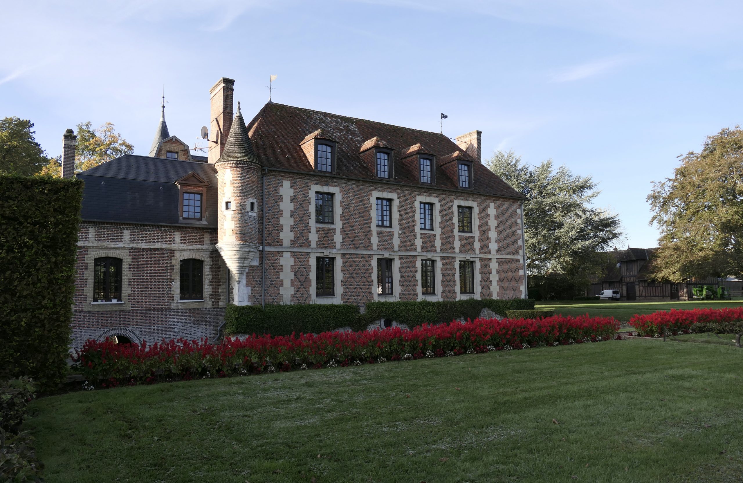 Nous faisons le tour du manoir : façade ouest d’où l’on voit bien les douves puis façade nord qui donne sur un beau jardin (fruitier principalement), agrémenté de magnifiques sauges rouges qui rehaussent l’édifice.