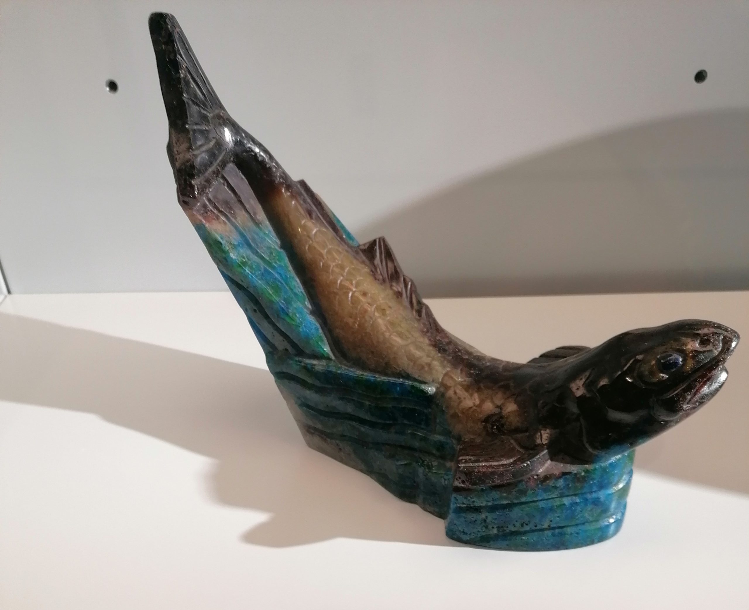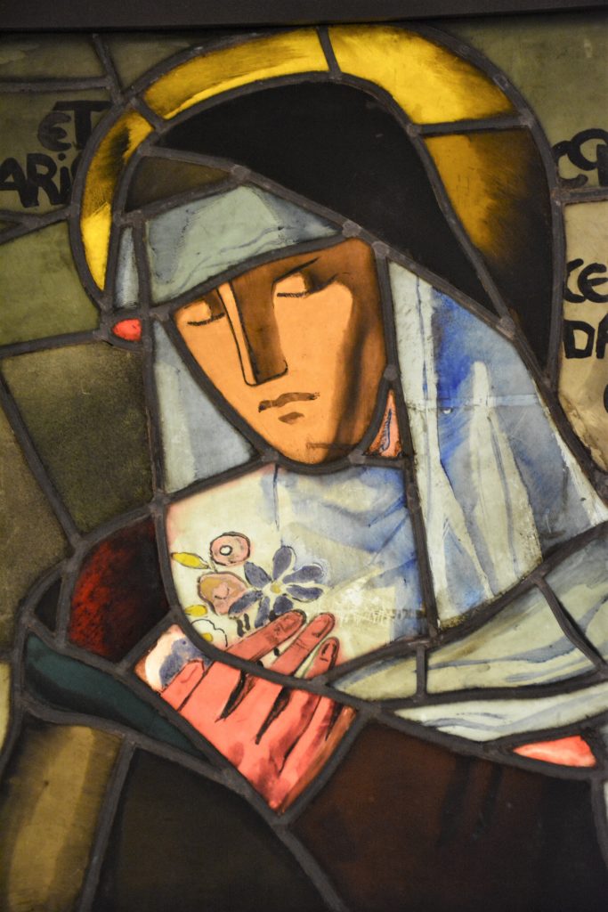 Vitrail « Notre Dame de la vie intérieure » Peugniez (1931) et Sculpture « poisson nageant » F. Décorchemont (1958)